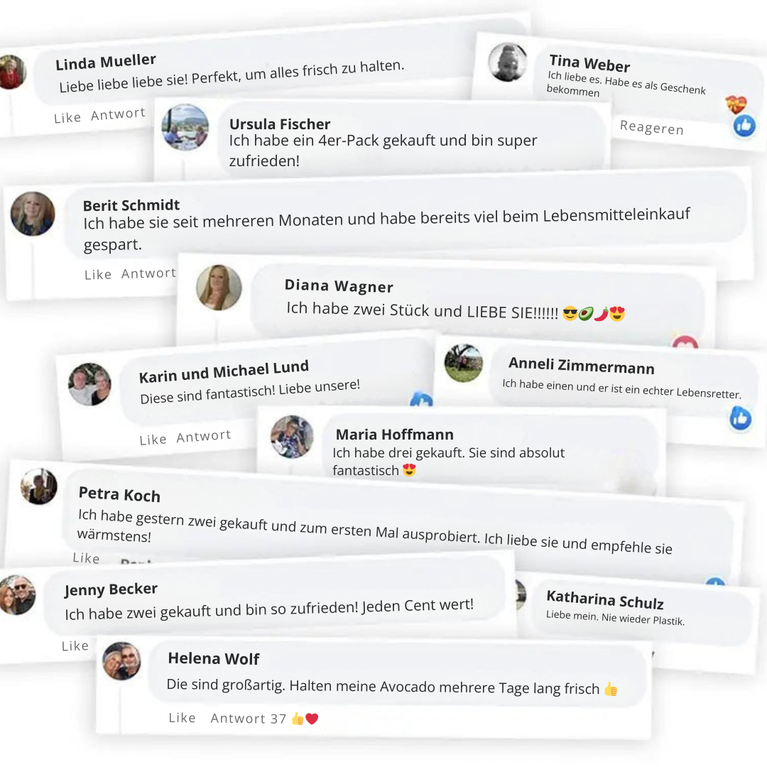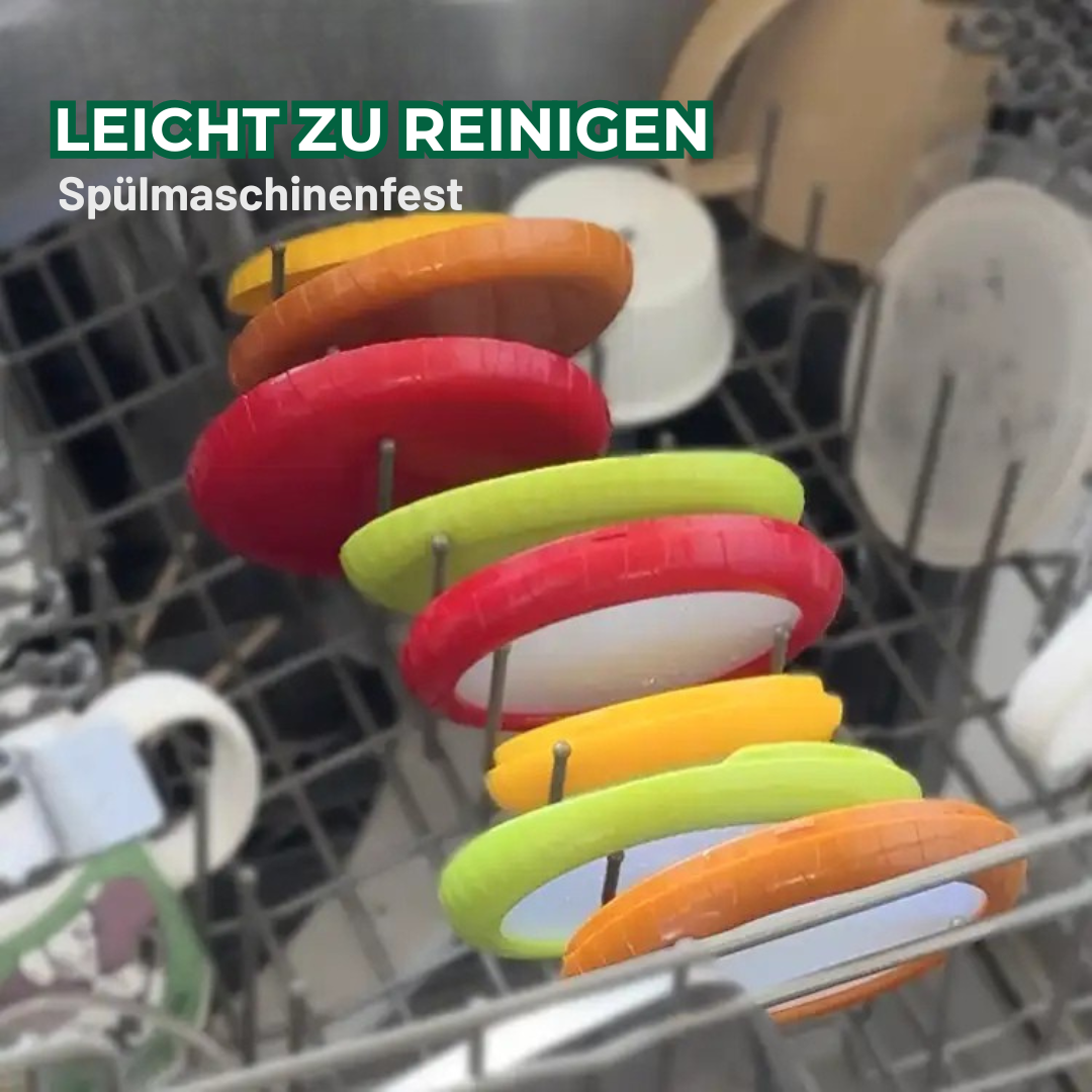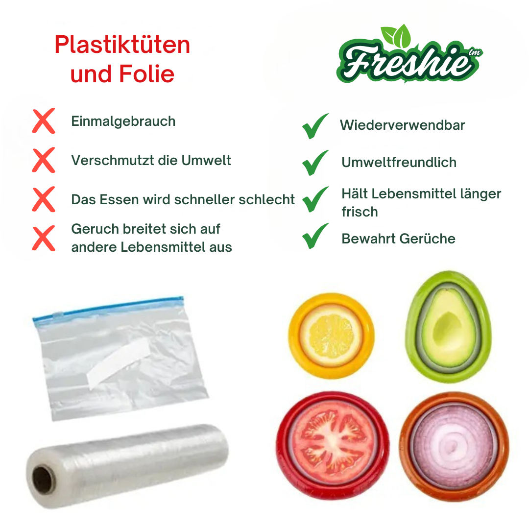 100 % SICHER FÜR FAMILIE UND UMWELT: Freshie sind aus hochwertigem, lebensmittelechtem Silikon hergestellt, völlig frei von BPA, PFAS und Phthalaten. Halten Sie Lebensmittel frisch ohne schädliche Chemikalien!