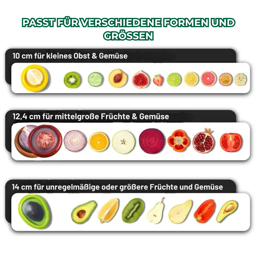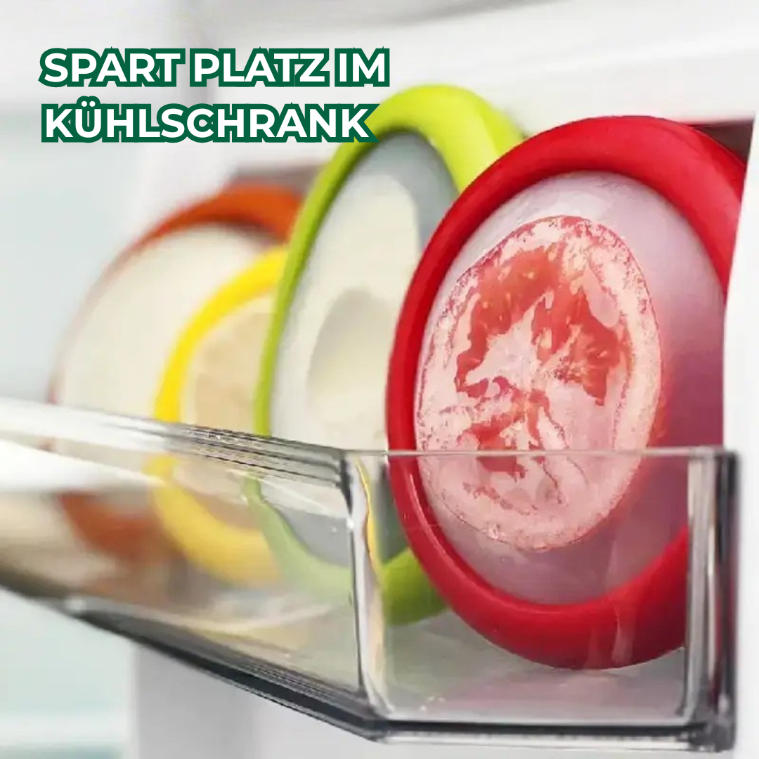 LUFTDICHTE VERSIEGELUNG FÜR LANGANHALTENDE FRISCHE: Freshie verfügt über ein fortschrittliches Silikondesign, das sich dehnt und sich um angeschnittene Früchte und Gemüse formt. Diese dichte Versiegelung schließt die Frische ein und eliminiert Gerüche, wodurch Ihre Produkte länger frisch bleiben und Ihr Kühlschrank geruchsfrei bleibt!