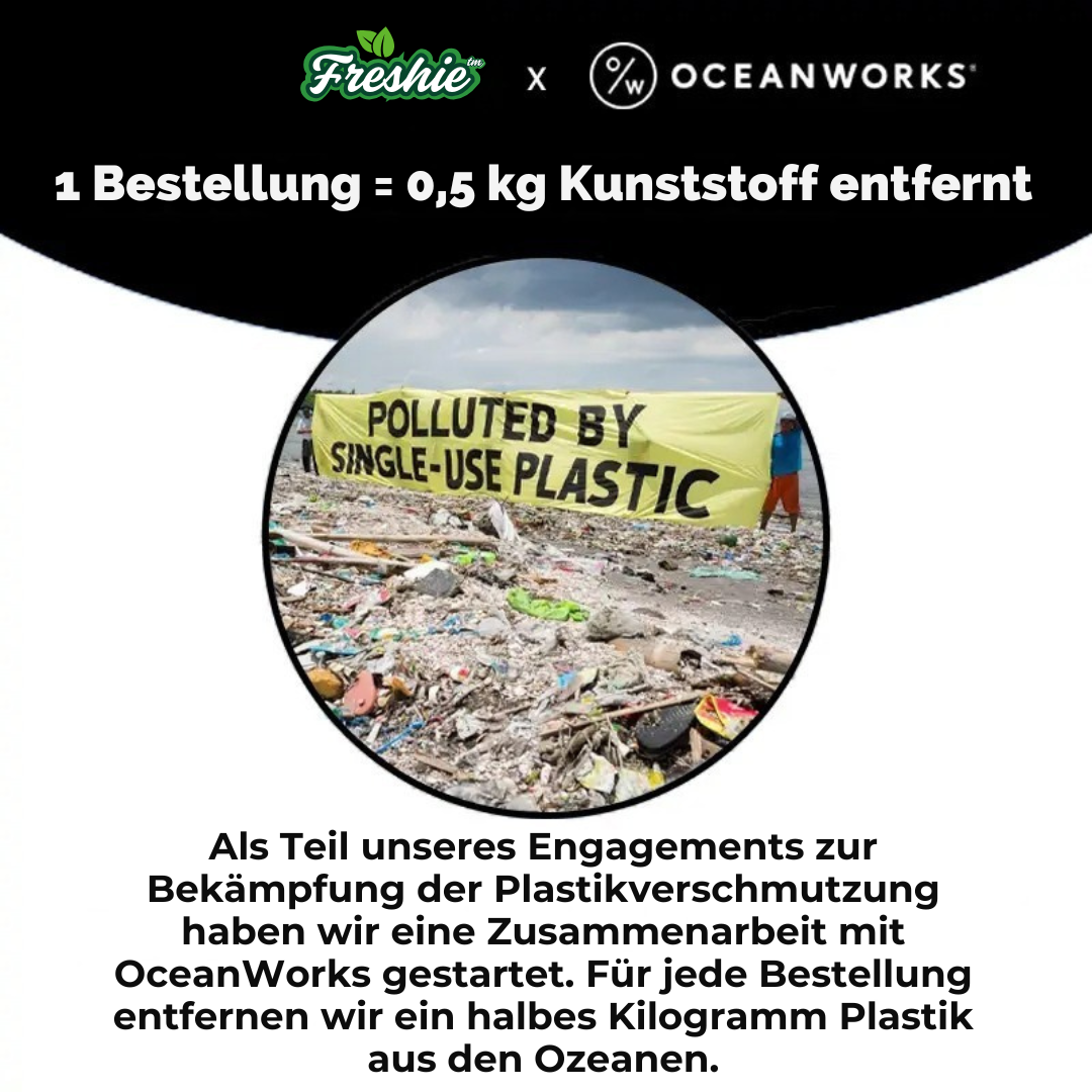 LÖSUNG DER VERSCHMUTZUNGSKRISE: Während Freshie zukünftige Plastikabfälle verhindert, schädigt die bestehende Verschmutzung weiterhin unsere Meere... Jährlich werden über 100 Millionen Meerestiere verletzt und Mikroplastik ist mittlerweile sogar in unserer Nahrung vorhanden! Deshalb haben wir uns mit OceanWorks zusammengetan, um für jede Bestellung 0,5 kg Meeresplastik zu entfernen - wir gehen sowohl das Abfallproblem von morgen als auch die Krise von heute an.