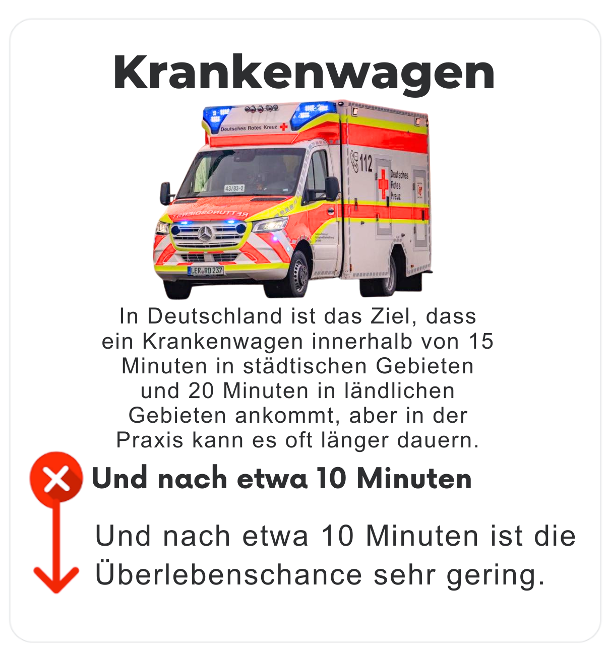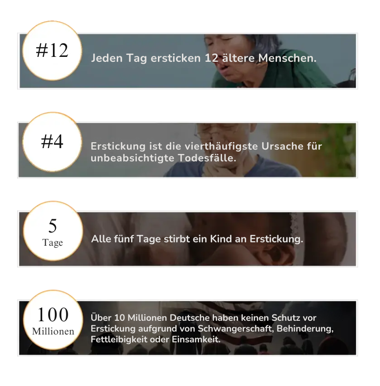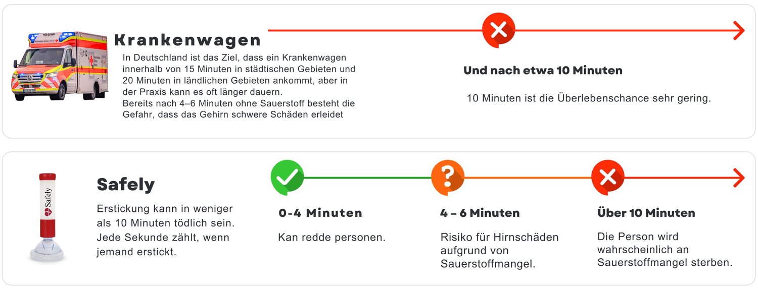 In nur 4 Minuten kann Ersticken zu Hirnschäden führen, die einen lebenslangen Verlust der Unabhängigkeit zur Folge haben können, während die Reaktionszeit eines Krankenwagens 7 bis 14 Minuten betragen kann.