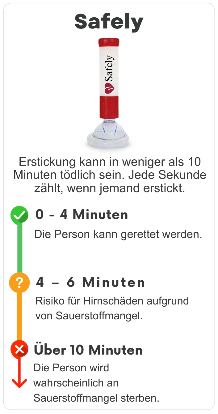 Safely ist ein einfach zu bedienendes Erstickungsrettungsgerät, das Ihr Leben oder das Leben eines geliebten Menschen bei einem Erstickungsnotfall retten kann.