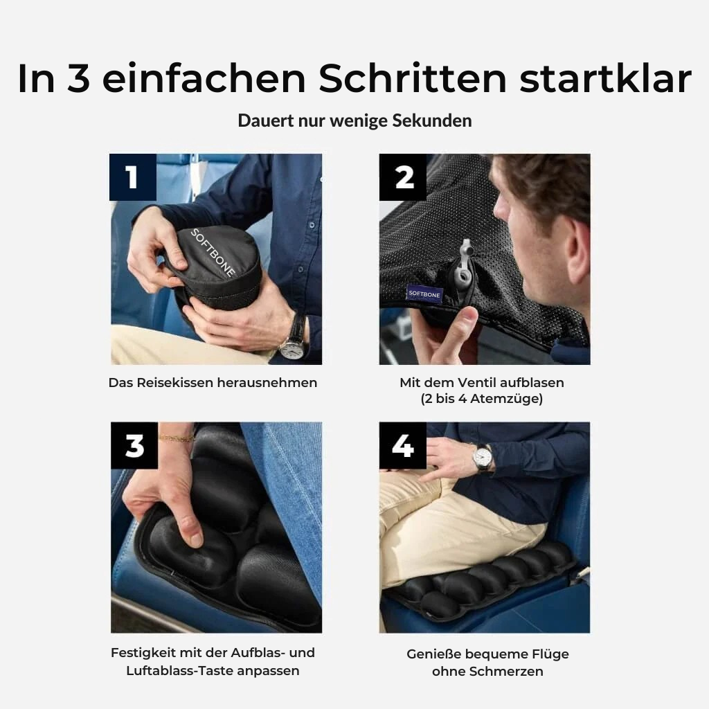 Das Softbone Reisekissen besteht aus hochwertigen Materialien, die luftdicht sind und verhindern, dass Luft entweicht. Die verstärkten Nähte und das stabile Ventilsystem sorgen dafür, dass das Kissen während des gesamten Fluges gut aufgeblasen bleibt.